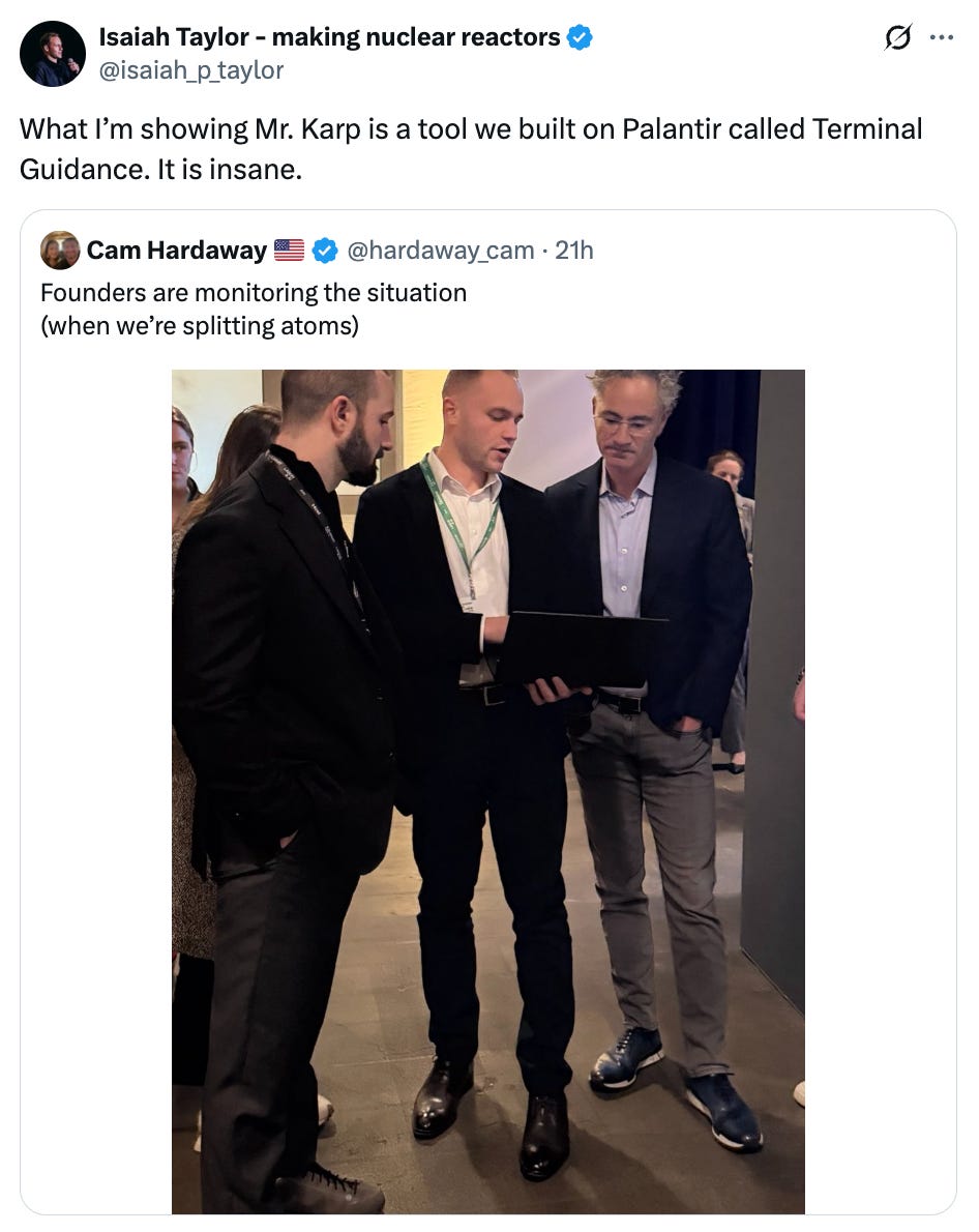 Valar Atomicsā CEO disclosed his startup is using Palantir. Valar is one of the most valuable nuclear startups (my favourite one). In November, it raised $130mn led by Snowpoint Ventures and backed by Andurilās founder, Palmer Lucky, and Palantirās CTO, Shyam Sankar.