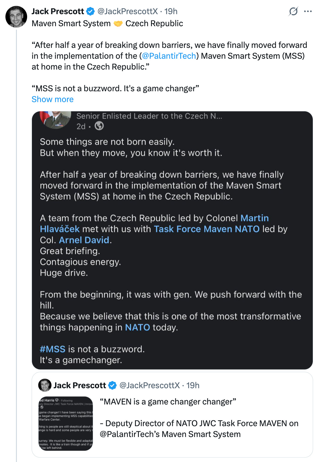 Palantir expanded its Maven Smart System (AI targeting) in the Czech Republic.